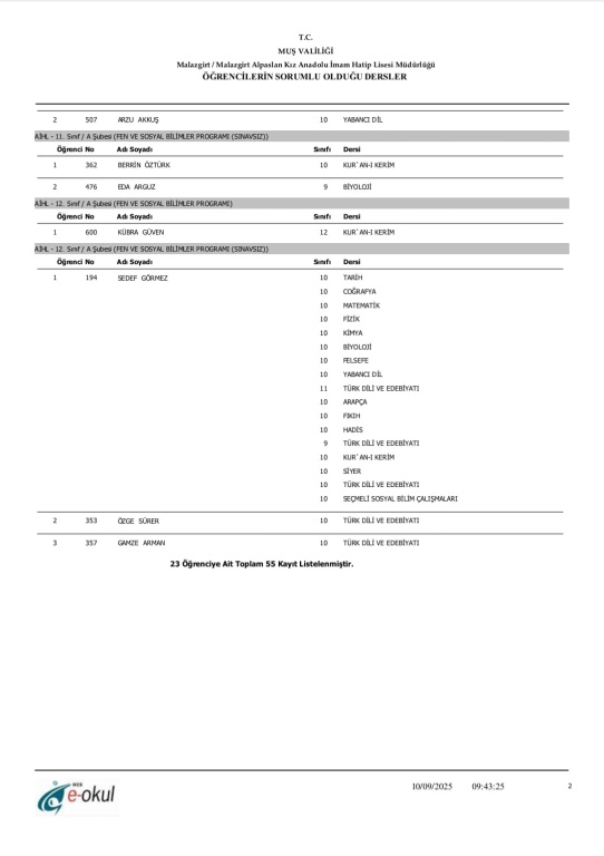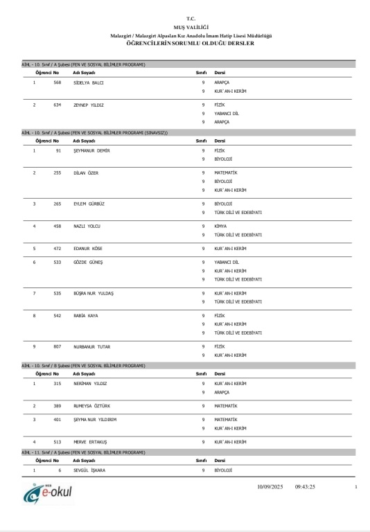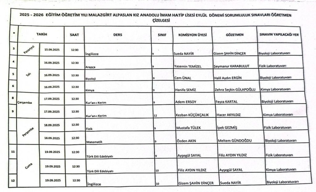2025-2026 EĞİTİM - ÖĞRETİM YILI EYLÜL DÖNEMİ SORUMLULUK SINAVLARI
